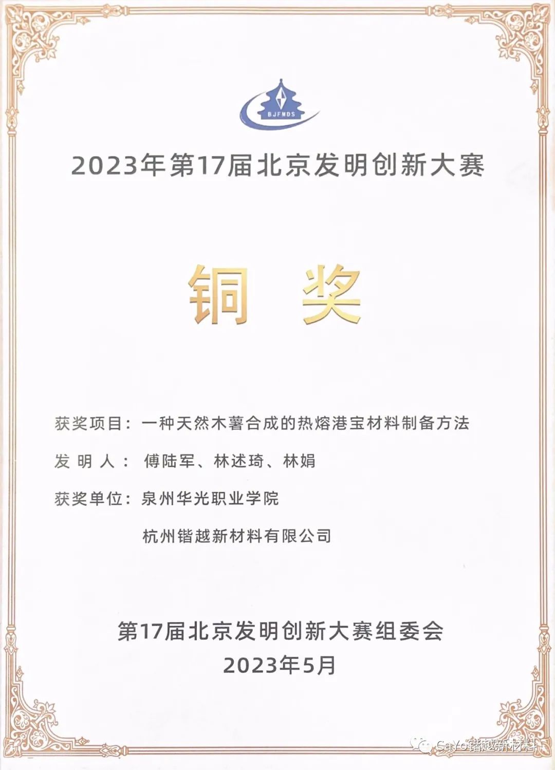 日前,北京发明协会在京举办了第17届北京发明创新大赛颁奖会,泉州华光职业学院林述琦副校长,产教融合研究院林娟院长和杭州锴越新材料有限公司傅陆军总经理的发明创新产品——“一种天然木薯合成的热熔港宝材料制备方法”在本次上大赛获得铜奖。